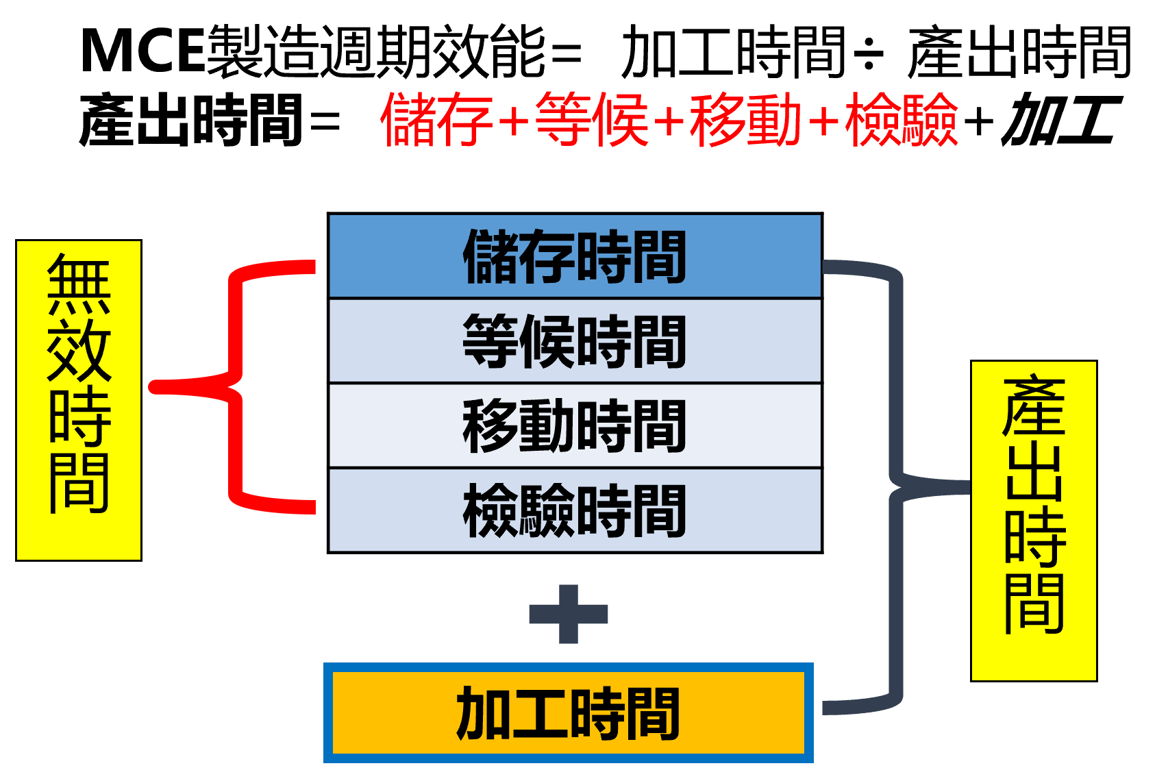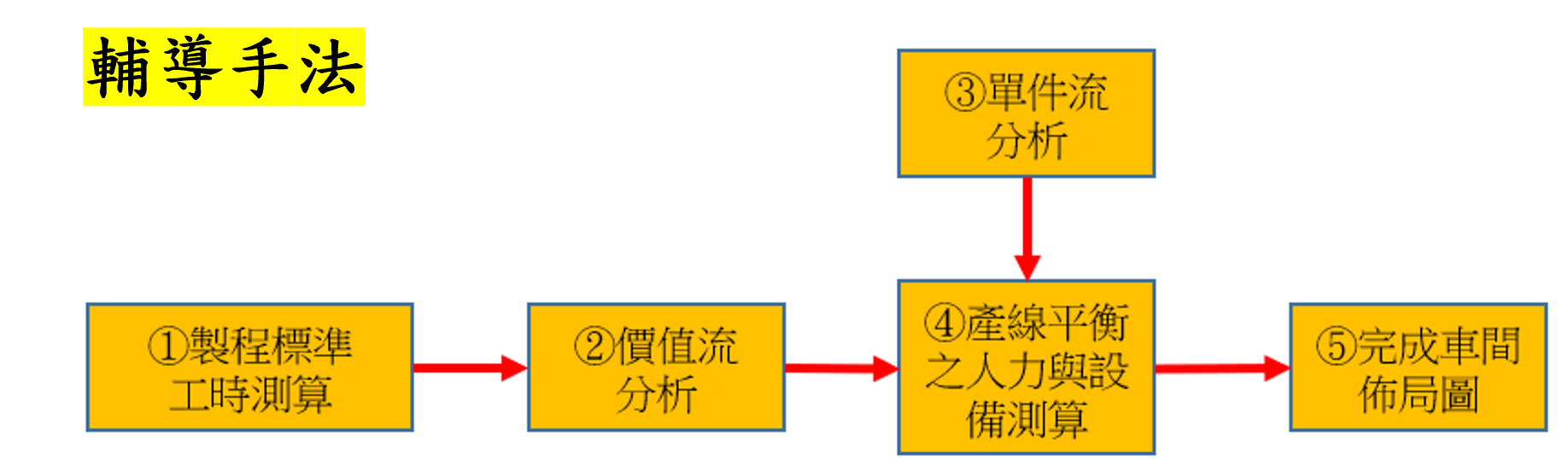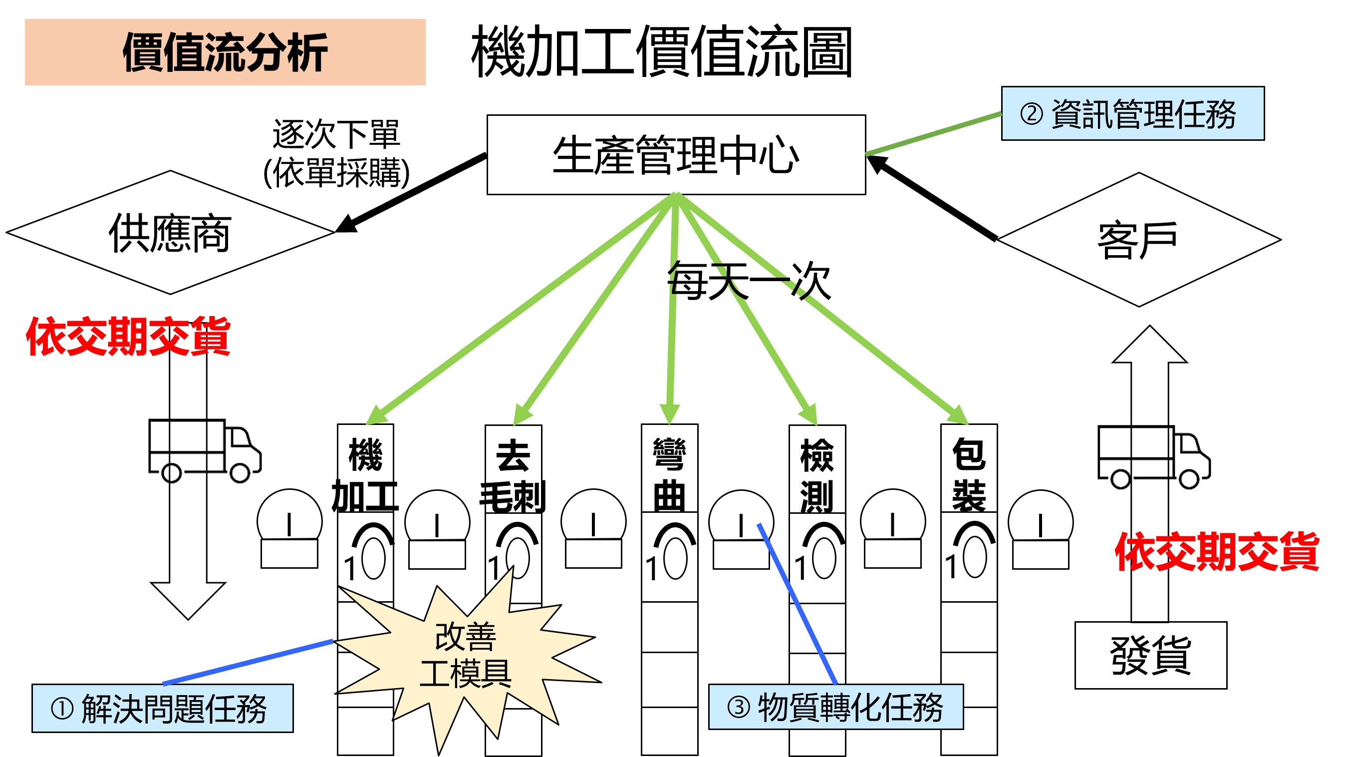 1. 價值流分析:透過對準備時間、加工時間、移動時間、等待時間、儲存時間、檢驗時間等生產時間分析,找出無效工時所在,精准的加以改善。